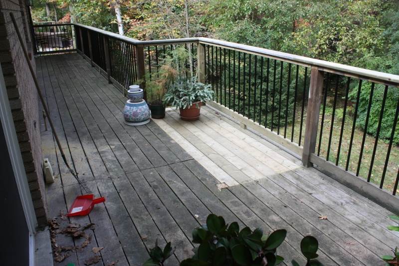 我要改建这个阳台,除了扩大一点面积外,另一个重点就是变换栏杆。原来是用1x6的宽木板做栏杆,栏间透光的空隙只剩下了约40%。我这房的一大特色是背对溪谷树林,这栏杆的遮挡真是大煞风景,辜负了天赐的景色,所以一定要改变,清除障碍,还我绿荫。旧貌。