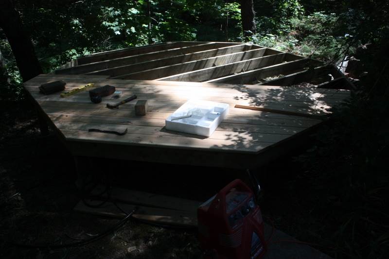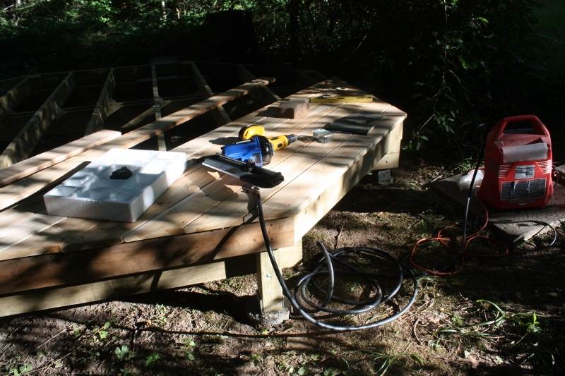 用了三天才把平台地板做好。最后在入口的一边台下,摆上了两层水泥台阶。我知道在木台旁用木头做台阶更般配,可是我这台阶是以前随某个房子带来的,免费而无用,就正好摆在这里了。