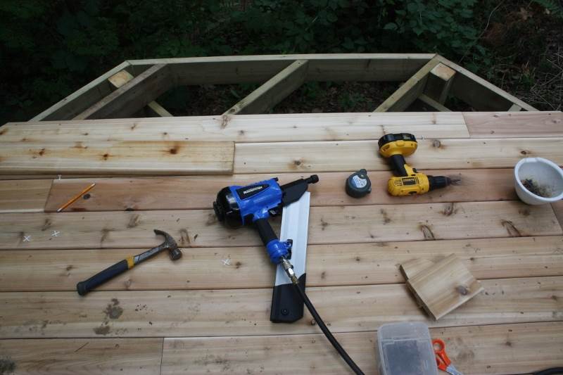 然后是钉平台的地板,这属于面子工程了,采用cedar,以求与其上的亭子用料一致。木板的规格是5/4x6x10,是做阳台地板的标准厚度。因为我设计的入口是在一角斜面,所以地板的走向也随之变化,与小梁结构形成45度夹角。这样从结构上来说,是更结实了,保证不会变形。