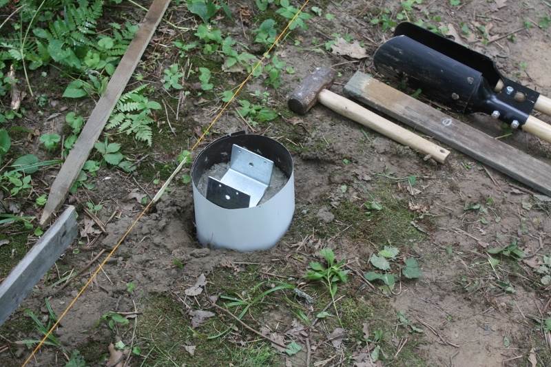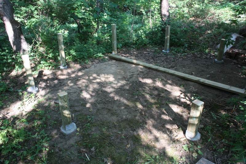 建亭子的基础有几种方法。一是满铺水泥地面,这在我的林间坡地上不适用。二是在地面上摆水泥墩,做法简易却不太牢靠。三是在地面上挖洞埋入水泥桩,最牢靠却也很费力。在美国北方和加拿大,因为冬季冻土层问题,冻融交替之间会引起土层起伏,所以建房或较大的固定结构都要求把基础挖到冻土层以下。在美国南方的人根本见不到冰雪,就根本不用考虑这个问题。在犹豫了很久之后,我终于决定还是要不避繁难,在地面上挖洞埋水泥。坡地上的泥土更可能下滑移动,不能用水泥墩单摆浮搁。