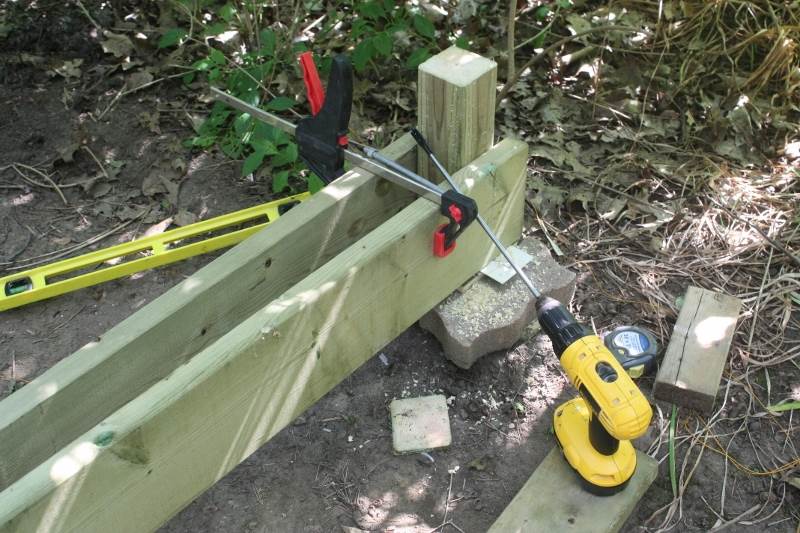 先把2x8做的大梁固定在木桩上,中间四长,两边两短,用长螺丝穿透固定。打眼时,普通的木钻头不够长,我专门去买了个长钻头。