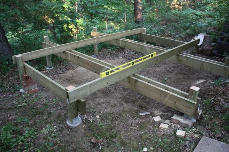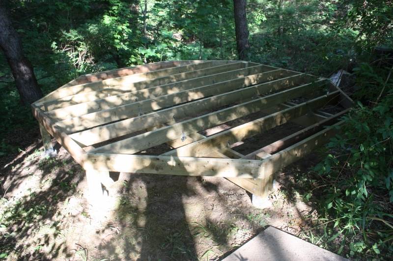 下一步,在大梁之上垂直铺设2x6的小梁,按照设计,是五长两中两短,共九根,在周围环绕以八角形的边梁。这一步有点复杂,要量准锯齐。过程中启用了部分过去修房拆下来的木料,我总是自觉地废物利用。两层梁相交处,加上了铁件相连,看细部的感觉是固若金汤。装梁时细量的结果,各边长的误差不超过半英寸,这说明我的八柱位置定得是相当准确了。平台的结构完成以后,可以看出大轮廓了。