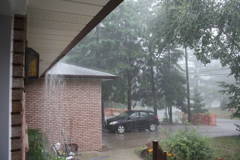2012年7月一次大雨时,前檐的雨水溢出水槽,形成水帘,像瀑布一样。我抓拍了这张照片,正好立此存照,作为前后对比。