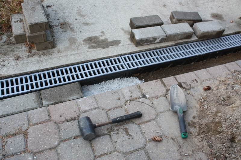 把与水泥地面相连的车路地砖掀起来一排,向下挖深。先挖出的是铺砖时垫的沙子和碎石,后触及到泥土。多次调整到合适的深度,使格栅表面略低于水泥地面。