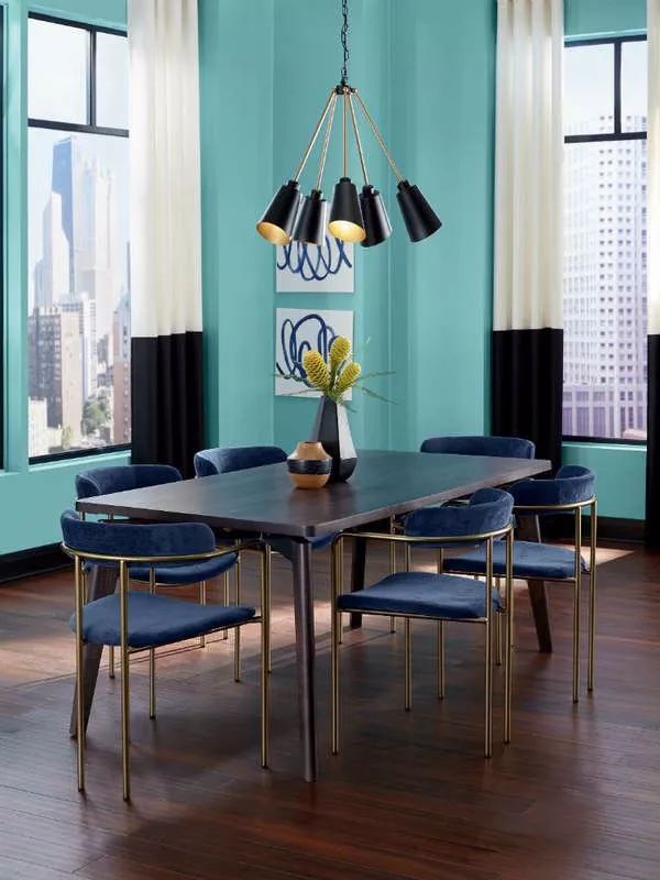 Sherwin-Williams的高级色彩设计师Ashley Banbury表示,这款油漆不但可以掩盖墙上的一些小坑和小瑕疵。还可以与很多种颜色相搭配,就像上图中的这个餐厅,您可以看到深色的吊灯和窗帘,还有餐桌,在绿松石般的墙壁的映衬下有着非常舒服的明暗对比。