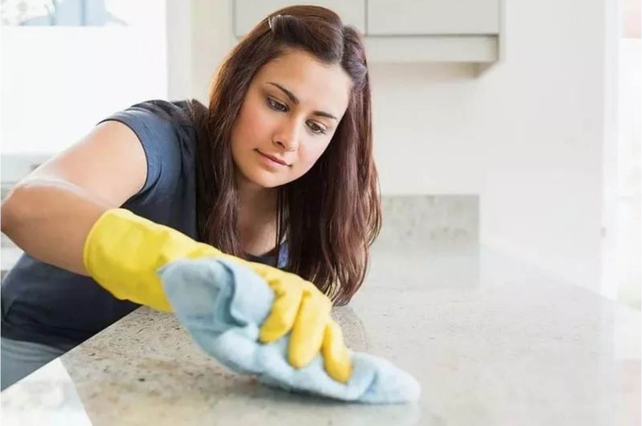 开始清洁台面前,要先拿走台面上多余的物品,以保证可以清洁到所有地方。首先,先要擦掉任何黏在柜台上的粘性残留物,如果发现泄漏的液体已经凝结,需要用热湿抹布把硬块融化,然后取下结块的碎片。
