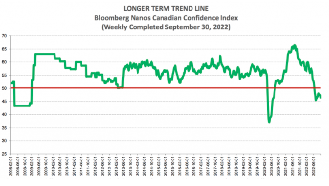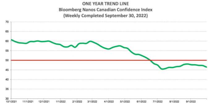 这是根据 Bloomberg Nanos 加拿大信心指数 (BNCCI) 的最新数据得出的,该数据显示,继 8 月份小幅反弹后,加拿大消费者信心连续五周下滑。事实上,消费者信心低于疫情高峰期以及 2008 年和 2009 年最近两次经济危机期间的低点。