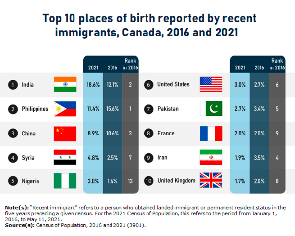 印度以18.6%的比例成为最近5年最大的新移民来源国,较2016年增长6.5%