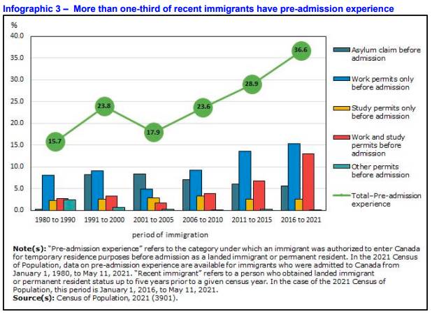 36.6%的新移民有加拿大生活经验, 主要是工签,学签和难民