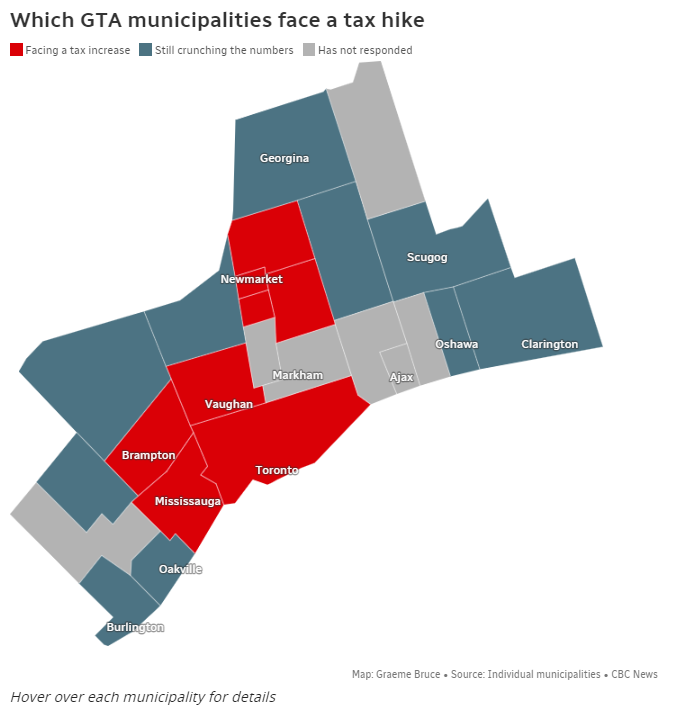 在接受调查的 GTA 市政当局中,有七个市政当局要么没有回应。另有 10 位受访者告诉 CBC 新闻,他们仍在计算数字,尚未得出可能的加税幅度。