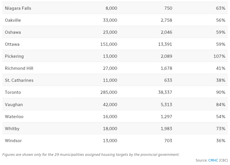 包括渥太华、汉密尔顿、伦敦、基奇纳和万锦在内的其他大城市正在以完成目标所需速度的大约50%至65%推进建设。